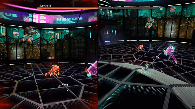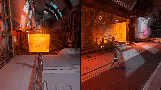- 분석: 같은 공간에서 서로 다른 각도로 상호작용할 때 발생할 수 있는 시각적 혼동을 막기 위해, 카메라 시야각를 적절히 조절하고 화면별로 시야를 꽉 채우는 대형 오브젝트(주황색 홀로그램 벽 등)를 배치하여 두 화면의 공간감을 시각적으로 단절시켰습니다.
