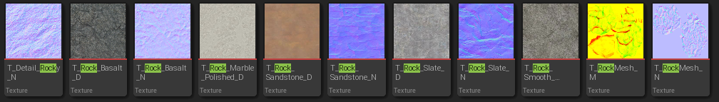 StarterContent의 텍스처 폴더를 열어보니 생각보다 Rock 텍스처의 종류가 많았고, 파일명 끝에 _D, _N 같은 알파벳이 붙어있었습니다.